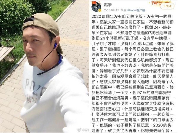 赵擎15日在微博发文谈起这次农历春节,自己除夕、初一都关在家里,每天看着新闻了解疫情最新状况,也让赵擎大喊无聊,没有早中晚餐,肚子饿了才吃;没有几点睡几点醒,想睡了就睡,累了继续睡,有健身习惯的他坦言现在健身房开了我也不敢去呀,显得相当无奈。