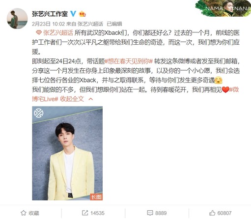 张艺兴工作室在23日发布公告,请身在武汉的粉丝分享近一个月发生在你身上印象最深刻的故事和1个心愿,工作室会选出7个不同行业的人,由张艺兴亲自联系、送上应援。其中,一位不久前刚到武汉前线支援的护理师中选,并真的接到了张艺兴的来电,事后激动地在微博写下通话内容,掀起其他粉丝热议。