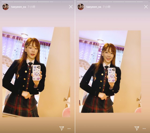 本月初父亲过世而暂停活动回到全州老家的太妍,今天(23日) 在Instagram 限时动态留言说:因为回家呀了,所以得穿一下校服,并公开她在卧室里,穿着母校全州艺术高中一系列校服自拍照,一套是浅蓝色带有金色钮扣与白领的制服,另一套则是深蓝色西装外套,搭配格纹裙与领带。