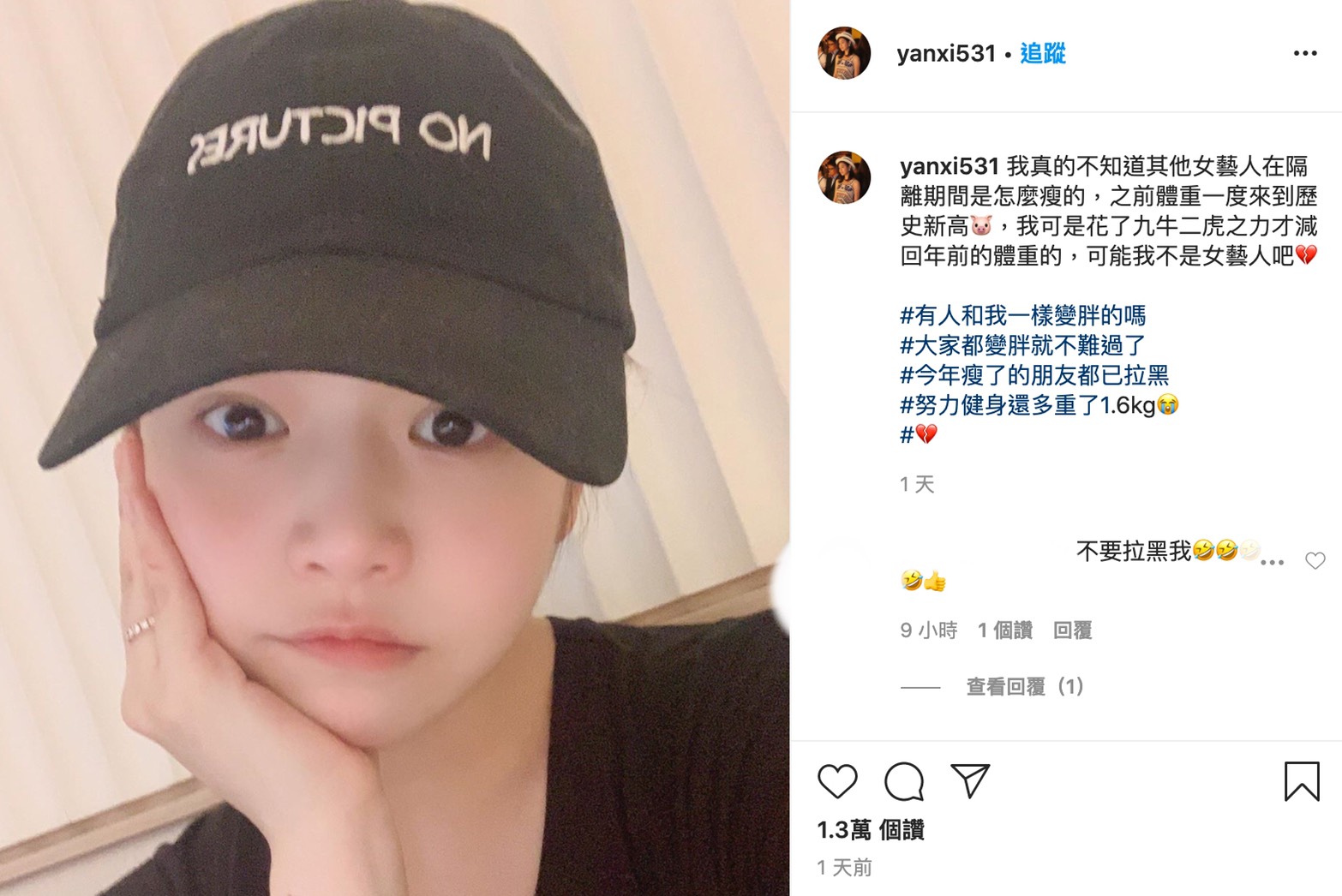 但她昨日却在IG上Po文抱怨:我真的不知道其他女艺人在隔离期间是怎么瘦的,之前体重一度来到历史新高,我可是花了九牛二虎之力才减回年前的体重的,可能我不是女艺人吧,也打趣问粉丝有没有都一起变胖、都变胖就不难过了还说要拉黑已经瘦下来的朋友。