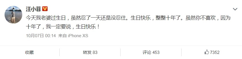 如今大S迎来44岁生日,汪小菲虽然顺着老婆的意沉默了一天,第二天还是忍不住发文了,今天我老婆过生日,虽然忍了一天还是没忍住。生日快乐,整整十年了。虽然你不喜欢,因为十年了,我一定要说,生日快乐!