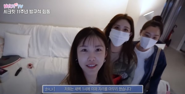 接着,全烋星与郑河娜和宋枝恩回忆了10周年一起去的济州岛旅游影片,聊天聊到半夜1点才结束聚会,而女孩们久违的合体也让许多网友看了都相当怀念,纷纷在底下留言Secret是我的青春啊,11周年快乐、现在去KTV都还会点Secret的歌,没想到已经出道11年了、以前军旅生活都靠着Secret的歌撑下来的呢 。
