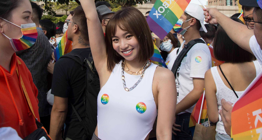 破亿小天后陈芳语(Kimberley)即将于12月发行最新专辑《公主病》,近期忙于宣传的她,今(31日)受邀出席台北同志大游行,对于首次在台湾参加同志游行,Kimberley陈芳语心底雀跃又兴奋,之前在美国有参加过同志游行,但从来没参加过台湾的,终于等到了,超级开心的!有别于昨晚的万圣节派对戴面具,她决定用素雅、轻便的装扮出席,仅在胸口左右两侧各贴上彩虹贴纸,给同志朋友双倍的支持。