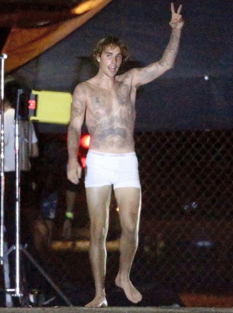 身高175 公分的小贾斯汀久违再度公开上空只穿一件内裤,担任CK 最称职的代言魔人,让自己全身的刺青图案一览无遗。发现狗仔在拍摄MV 现场之后,不仅打赤膊还赤足的小贾斯汀依然心情良好地向所有人打招呼,让粉丝不禁期待小贾斯汀下一首打单,究竟是什么样的MV 剧情才会让他难得再度裸上身入境呢?