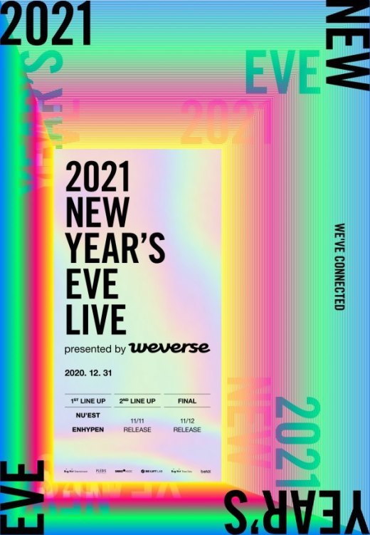 Big Hit Labels 在10日透过Weverse表示:《2021 NEW YEAR'S EVE LIVE presented by Weverse》将在12月31日于线上直播,同时还会进行线下公演,这是Big Hit Labels 旗下艺人们聚首一堂的第一个演唱会,还会和大家一起倒数迎接新年。线下公演会在地方自治团体的演出场地,为了遵守防疫指示,座位间会维持一定距离,因此只有部分座位限量发售,根据政府与地方自治团体的方针,如果线下公演无法进行的情况,将会只以线上直播形式进行。