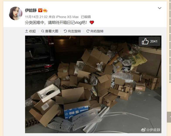 伊能静日前自爆今年双11用3个帐号买了900件商品,最贵的是上万元的面霜,最便宜的则是用人民币0.01元加购的会员试用品,买最多的是面膜。老公秦昊也发文问她,这900件商品中有多少件是买给老公的?伊能静幽默回答:快递箱都是你的,记得垃圾分类。