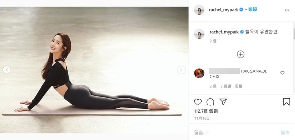 朴敏英日前在个人Instagram上公开2张穿着紧身运动服的照片,其中一张她侧躺在地,以手部支撑起上身,一脚侧边紧贴地板、一脚则跨向前90度弯曲,而她姿势中的亮点,便是著地的那只脚脚踝,居然伸直没有贴地,还离地超级远,她写下我脚踝算是比较柔软的类型,炫耀了一下肌力。