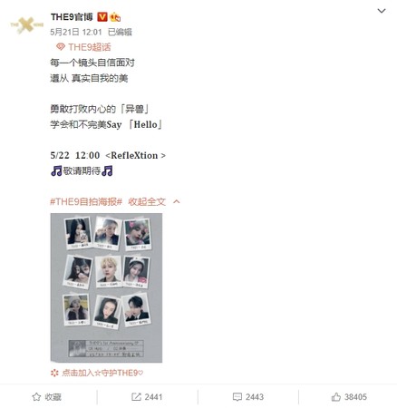 在成员将满一周年前夕,THE9今推出新专辑《RefleXtion》,其中包含2首新歌《异兽》和《Hello》。然而,成员之一的虞书欣今中午却在微博发文提问,???我们今天发歌??omg。另名团员安崎同样表示,我也不知道我们今天发歌。文末附上3个笑脸符号,突如其来的发言,让网友一头雾水,也令外界好奇其中是否发生误会。