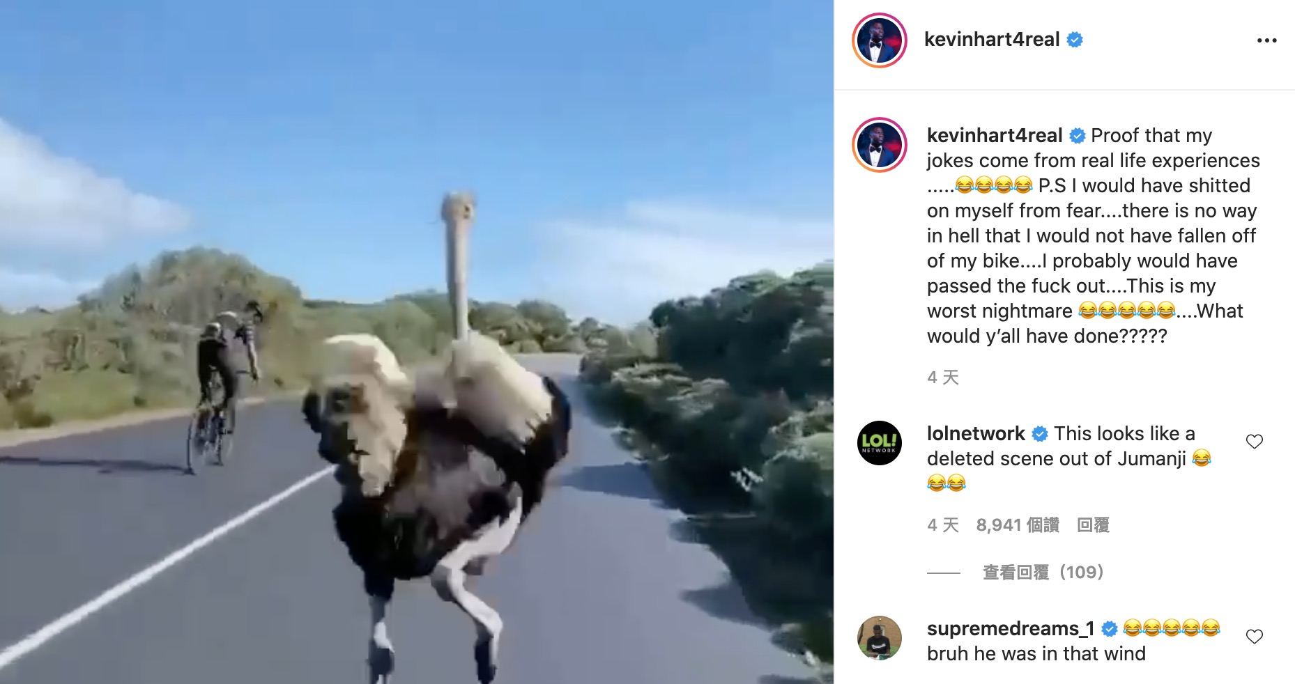 时隔14年,近日他在IG晒出一段鸵鸟的影片,并笑说我的段子都取材自真实生活,这就是证据!只见影片中一只超巨大的鸵鸟拔腿狂奔,追剧两名骑着自行车的车手,一路上还不断超车,画面看起来十分惊险,他还强调我真的会吓屎,是我的话绝对会从自行车上摔下来,这绝对是最可怕的恶梦!