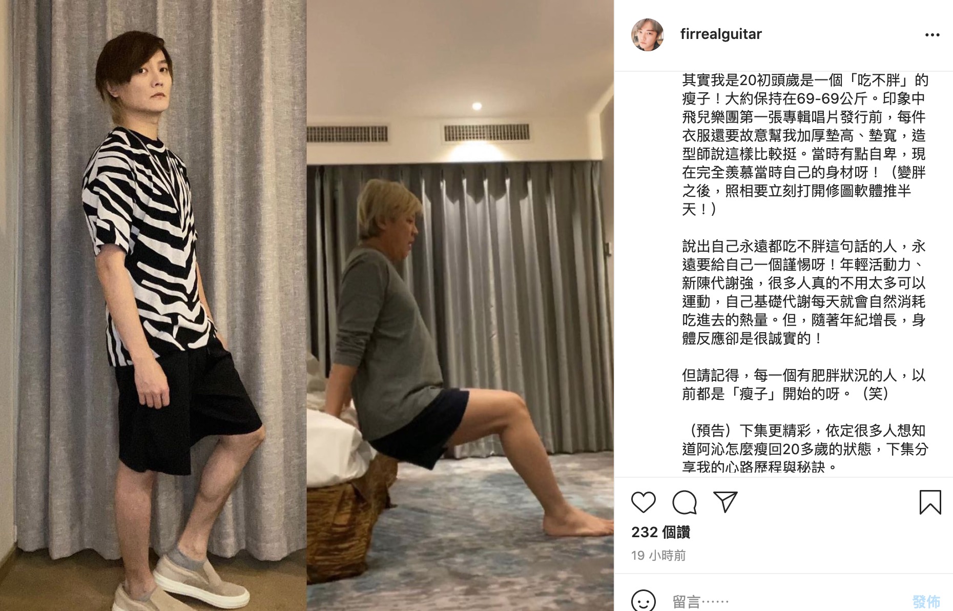 飞儿乐团的吉他手阿沁去年曾被网友揪出身材走样,过去他曾因内分泌失调暴肥,近日他也在IG分享自己的减肥过程,坦言自己去年曾一度胖到83公斤,与粉丝们分享自己1年内甩肉12公斤的心路历程,更公开了差距超大的前后对比照!