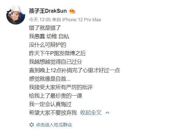 rapper孩子王(DrakSun)21日在微博PO出捐款截图,透露自己捐出人民币1.8万元救助郑州暴雨灾情,却被抓包其实只捐了人民币100元,引发哗然。他事后承认造假,紧急再补捐一笔钱,也出面向大众道歉:我接受大家所有严厉的批评。