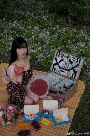 照片中,只见Yumi穿着细肩带碎花长裙,在充满花草的地上野餐,垫子上摆满各式甜点、水果,以及一大束玫瑰花朵,而在其中一张照片中,似乎因为胸前春光外泄,上传前刻意以P图处理,然而在其他未P画面中,仍展现出白皙肌肤及浑圆胸型,散发出性感又不失优雅气质。