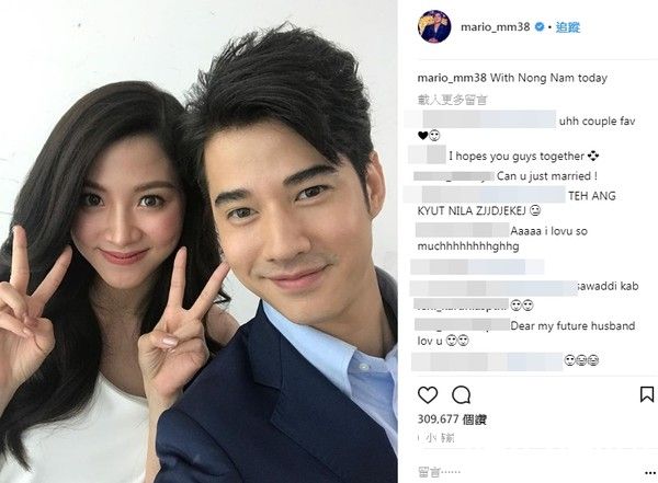 平采娜身穿削肩白色缎面礼服,乌黑长发烫上大波浪,站在马力欧身后双手比YA手势,也在IG晒出另一张合照,PO文Today with p’Shone(今天和阿亮学长)。两人喊的都是《初恋小事》电影中的名字,合照狂吸数十万个按赞,还有网友疯狂敲碗可以结婚吗、就命!男神女神同框了、拜托拍续集!