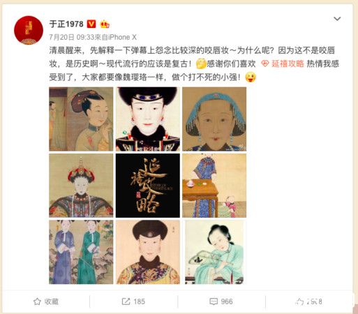 第三特点就是绛唇妆,认真考究历史而来,重点在上色时只点缀接近内侧地方,自然晕染开来,让双唇看起来更小巧,制作人于正也在微博po出清宫廷画师绘的《玫贵妃春贵人行乐图》,互相做一个对比。