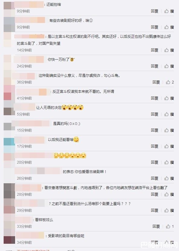 陆网对宫斗剧禁令半信半疑,有人质疑怪不得《皓镧传》没放首页了、没必要一棒子打死吧、权谋怎么定义?有人担忧日前宣布筹拍的《熹妃传》、《大明皇妃孙若微传》、《帝凰业》会受到影响,轮番感叹以后还能看啥、有些古装剧挺好的啊、令人无语的决定,也有人认同禁宫斗的决定,这种剧确实没什么意义,尽是尔虞我诈,勾心斗角。