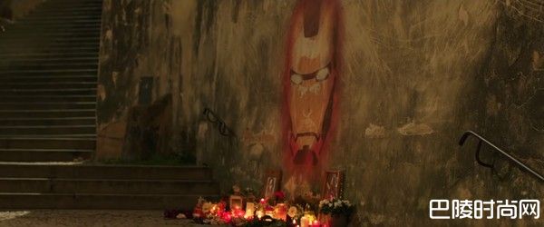 彼得帕克回到学校后,可见教室后面的布告栏画作都是钢铁人;预告中也出现一幕是墙上画有钢铁人的头像,下方摆满了悼念的花束、蜡烛与相片,可见失去钢铁人对于弹指后的世界来说无疑是颗震撼弹,人们也以自发形式纪念钢铁人这位超级英雄。
