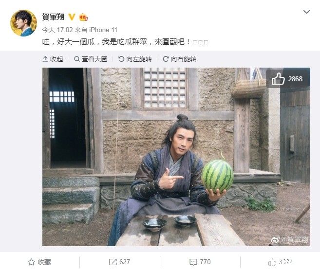 贺军翔26日在微博发文:哇,好大一个瓜,我是吃瓜群众,来围观吧!并PO出照片,只见他穿着古装的戏服入镜,左手则捧着一个大西瓜,搞笑地称自己是吃瓜群众,时间敏感,似乎是在隔空否认他被爆将演出台版《鬼怪》的传闻。