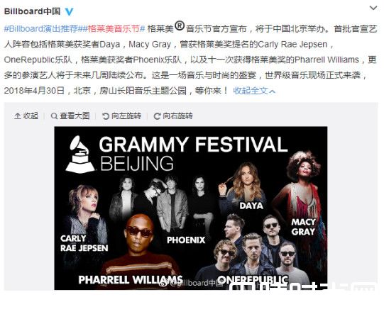 格莱美®音乐节官方宣布,将于2018年4月30日在中国北京长阳音乐主题公园举办。首批官宣艺人阵容包括格莱美获奖者Daya,MacyGray,曾获格莱美奖提名的Carly Rae Jepsen,JamesBay,OneRepublic乐队,格莱美获奖者Phoenix乐队,以及十一次获得格莱美奖的PharrellWilliams。更多的参演艺人阵容将于未来几周陆续公布。