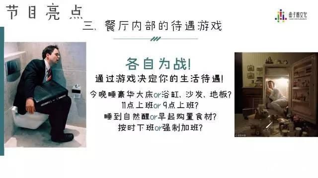 整个节目的创新点还在于粉丝的力量,粉丝承包心愿来助力偶像的行程,而且在这个节目中粉丝的权利还会增大,可以化身制作人承包游戏的任务和规则。因为是偶像进行经营秀,所以肯定会有各式各样的工作等待着他们,每一个人负责的工作和在餐厅的生活待遇都是根据游戏决定的。