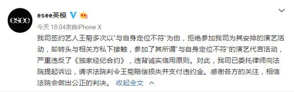 没想到在事情过去不到3星期,上海英模文化10日在官方微博上发出声明,指控王菊过去多次以与自身定位不符为由,拒绝配合参加为她安排的工作,没想到随后被发现,私下与该演艺活动的主办单位接触,参加了其所谓『与自身定位不符』的演艺活动,严重违反了《独家经纪合约》,违背诚实信用原则。对此上海英模文化决定向王菊提出告诉,要求赔偿损失及违约金。针对此事,王菊尚未给出任何回应。