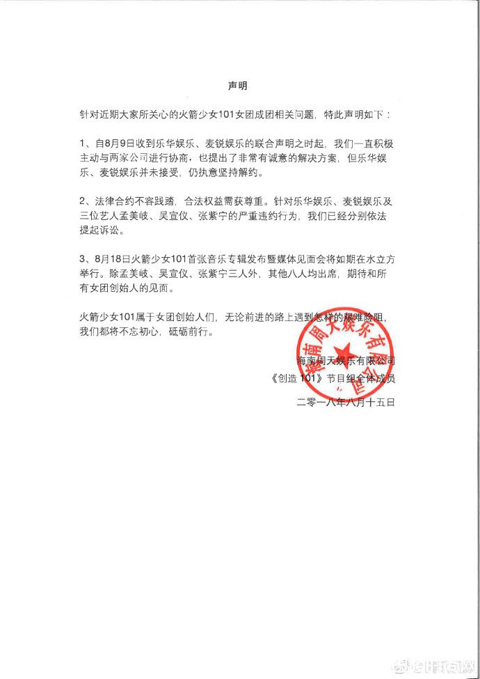 基于法律合约不容践踏,以及合法的权益应该获得尊重,腾讯方面决定针对乐华娱乐、麦锐娱乐及孟美岐、吴宣仪、紫宁的严重违约行为,分别依法提告,另外原定在18日举行的火箭少女101首张音乐专辑发布暨媒体见面会,将如期举行,除了孟美岐等三人之外,其余8名成员均出席。