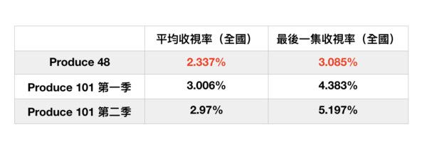 无论是平均还是最后一集收视率,《Produce 48》表现皆为最差。