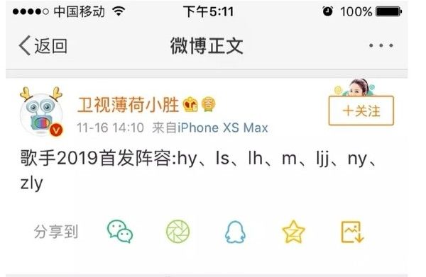 大陆娱乐博主卫视薄荷小胜发文:《歌手2019》首发阵容:hy、ls、lh、m、ljj、ny、zly,大家来解码。短短一行字吸引众多网友狂猜,其中lh被联想到鹿晗,ljj更被多人猜测是林俊杰,还有人直接猜所有歌手刘欢、那英、林俊杰、张靓颖、黄英、毛不易、刘胜。