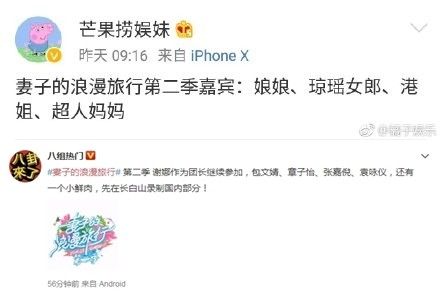 而近日更有网友在微博爆料,透露《妻子的浪漫旅行》第二季嘉宾有娘娘、琼瑶女郎、港姐以及超人妈妈,其中琼瑶女郎就被猜测是演过《又见一帘幽梦》的张嘉倪,港姐则是袁咏仪,超人妈妈则谣传是带女儿上过《妈妈是超人》第二季的包文婧。