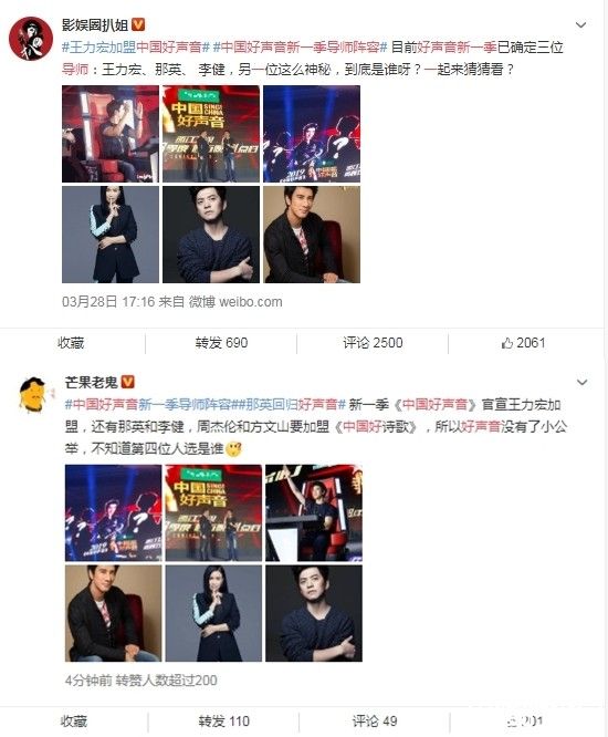 《中国好声音》官方目前只正式宣布王力宏加盟,另外3位导师中,网路上有网友爆料,其中一位是前三季的老班底那英将回归,还有上一季的李健将续任,最后一位则引起猜测,周杰伦也传出将与方文山合作新节目《中国好诗歌》,所以恐将缺席新一季。