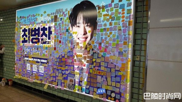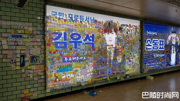 位于名次十几的练习生都可以人气那么旺,那前两周得到第一名的金宇硕,更是不得了,便利贴多到溢出来!金宇硕灯箱的便利贴活生生就是贴到墙壁上去,粉丝还是超有Sense的把他美丽(?)又帅气的脸露出来,让路人方便欣赏。