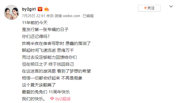 BY2在2008年7月25日正式出道,发行首张专辑《16未成年》,因清纯外貌及坚强的歌唱实力,很快获得外界关注。25日迎来出道11周年,两人在官方微博PO文,11年前的今天,是发行第一张专辑的日子,你们还记得吗?更透露前晚在宿舍写歌时,聊起过往时间快速飞逝,思绪万千而忍不住落泪。