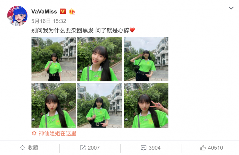 正当大家还在怀疑这份名单的真实性时,就有眼尖的网友发现,原本顶着鲜艳蓝发的VAVA,最近悄悄把头发染成黑发,并发文写下:别问我为什么要染回黑发,问了就是心碎VAVA 的这个举动,也被网友认为是为了符合《新说唱》的服仪规定不得不把头发染回来。