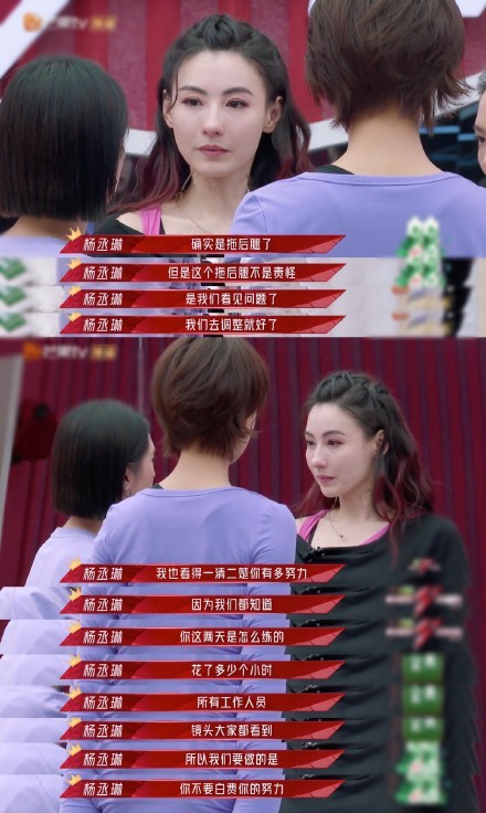 一旁的杨丞琳听到后直言:确实拖后腿了,但这个拖后腿不是责怪,是我们看见问题了,我们去调整就好!她表示自己知道张柏芝有多努力练习,大家也都看得一清二楚,她更暖心鼓励对方:所以我们要做的是,妳不要白费妳的努力。