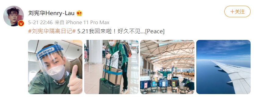 Henry 21日在微博贴出几张照片宣告回到中国,开心大呼我回来啦!好久不见,其中一张在机舱的自拍照中他不仅戴着口罩,脸上还罩着一层透明面罩,就连手上也戴着橡胶手套,堪称防疫相当全面,另外还晒出在机场拍的行李认证照以及在空中拍的风景照,蓝天白云景色十分优美。